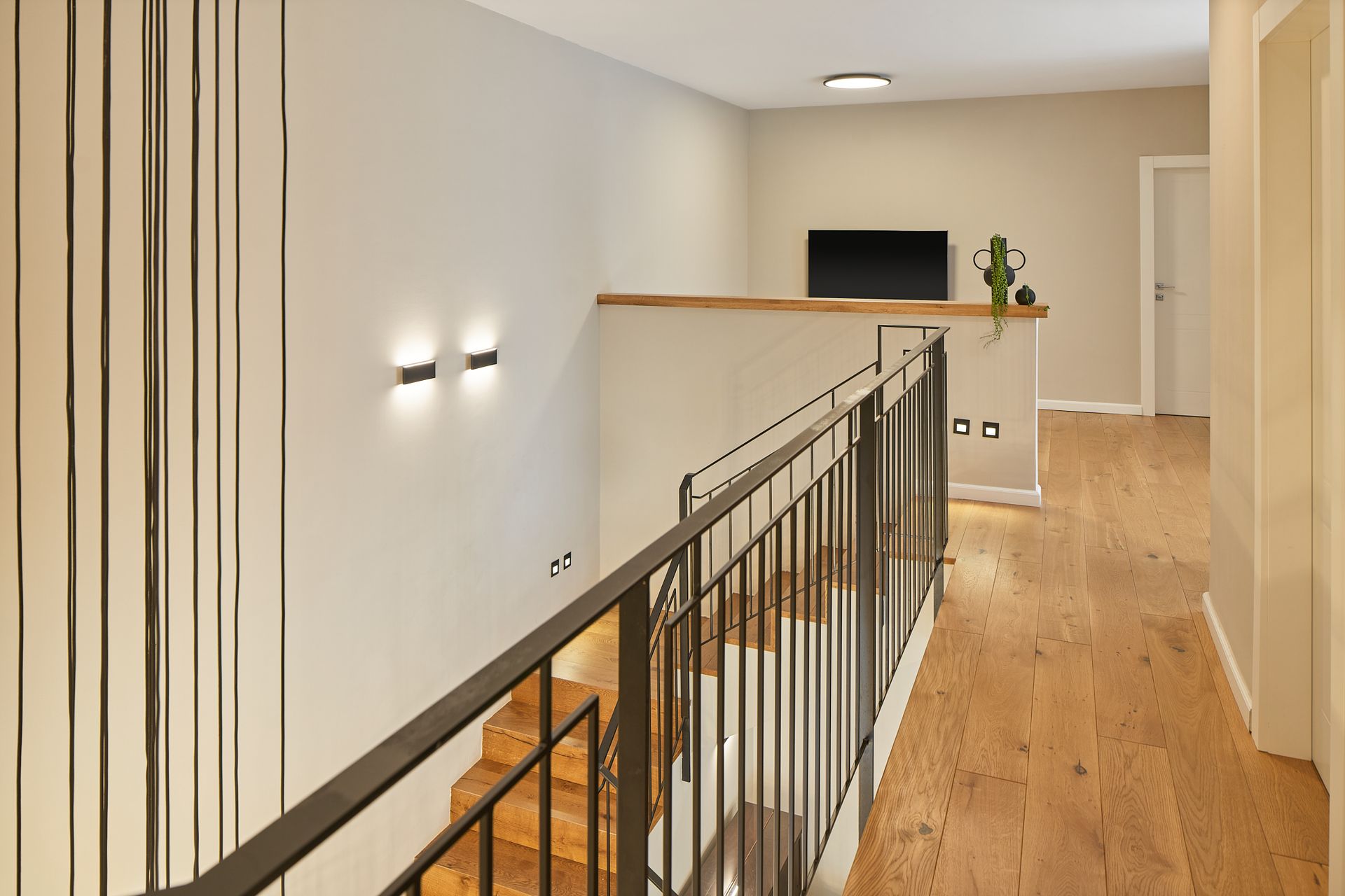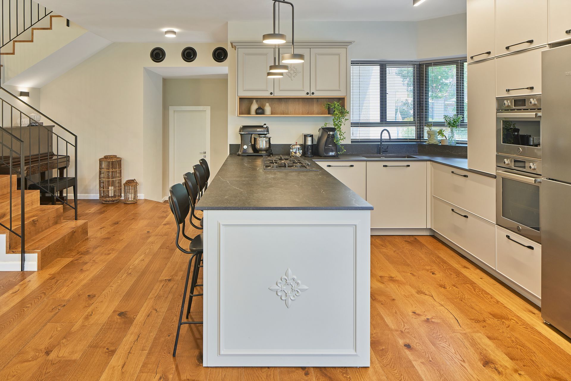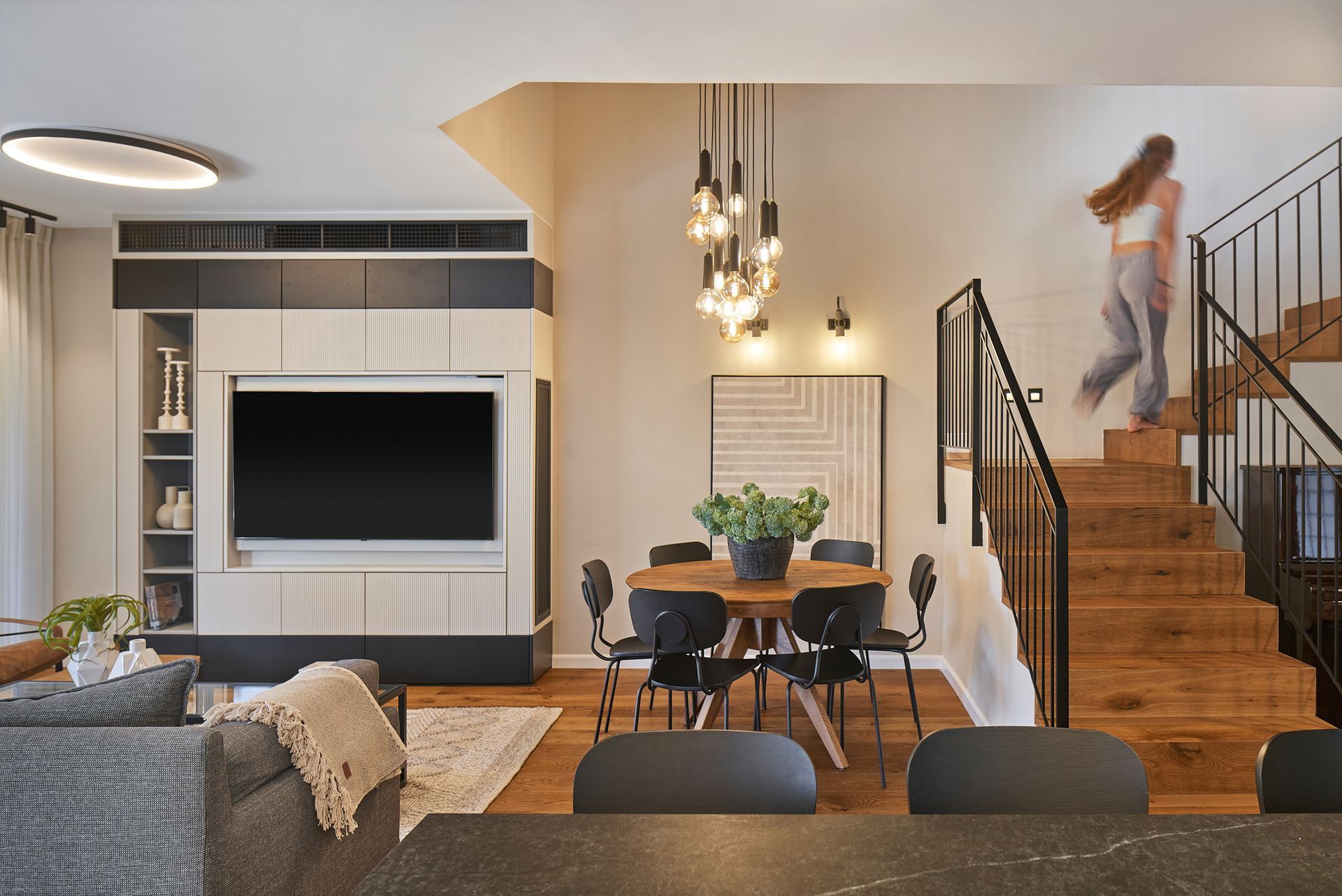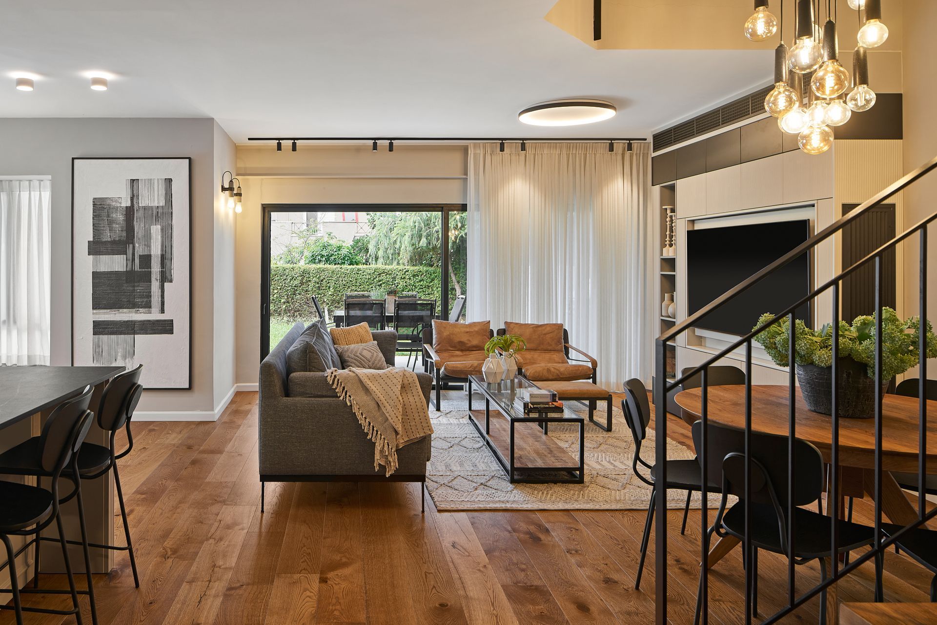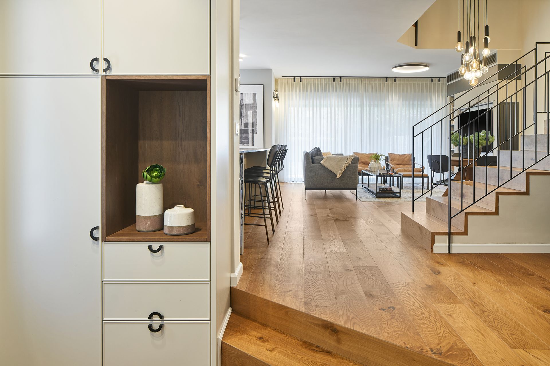 כל הבית חופה בפרקט עץ אלון איכותי כולל המדרגות, ליצירת אוירה חמה ומזמינה.