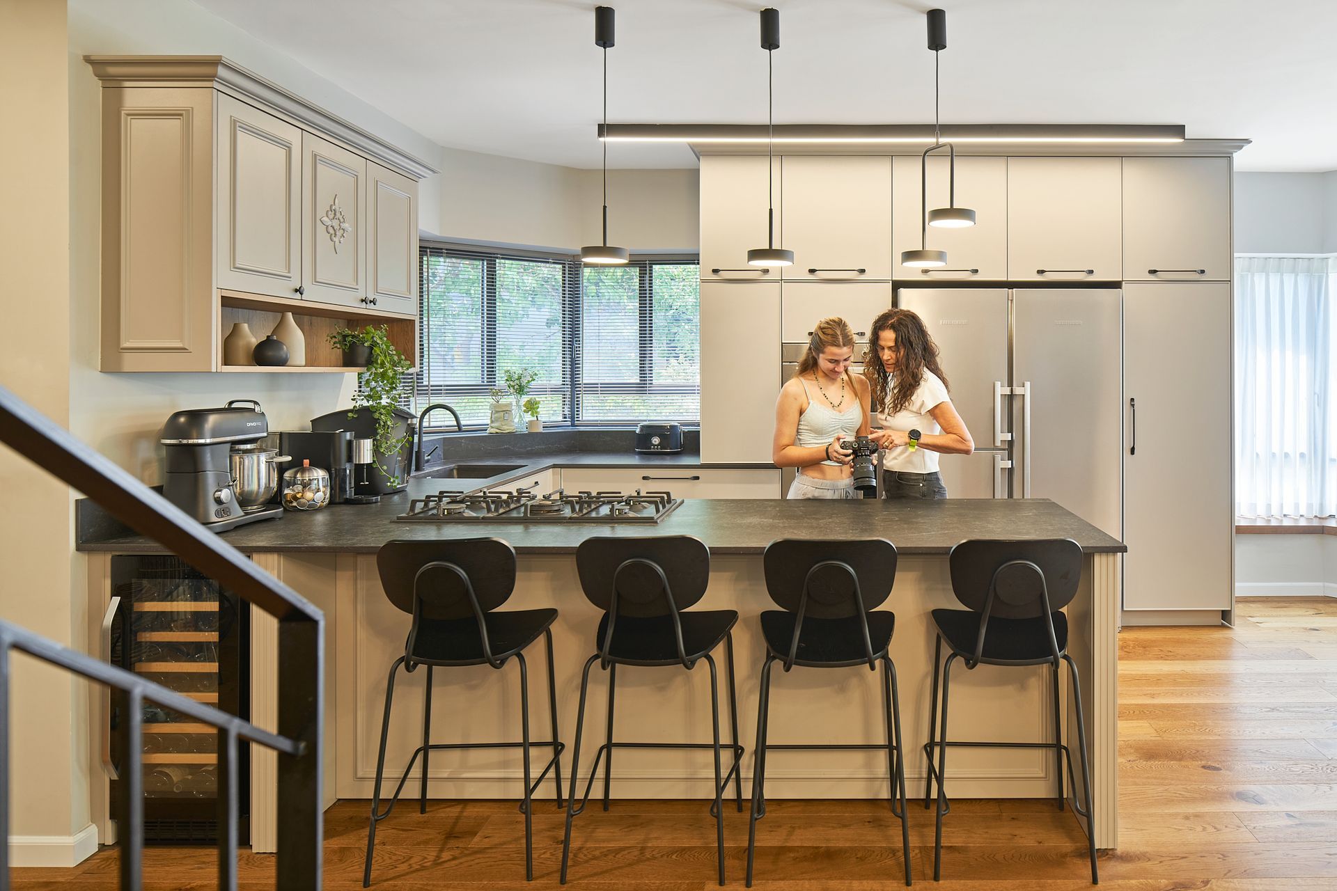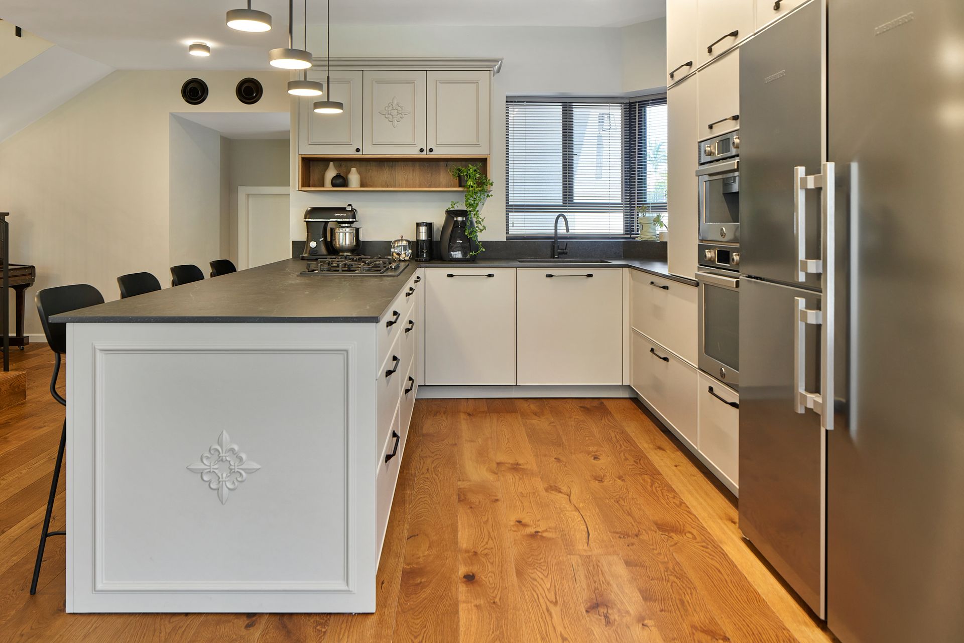 האי תוחם את המטבח ומצד שני פתוח לאזור הסלון ופינת האוכל, היה חשוב לבני הבית שתתאפשר צפיה בטלויזיה תוך כדי עבודה במטבח.