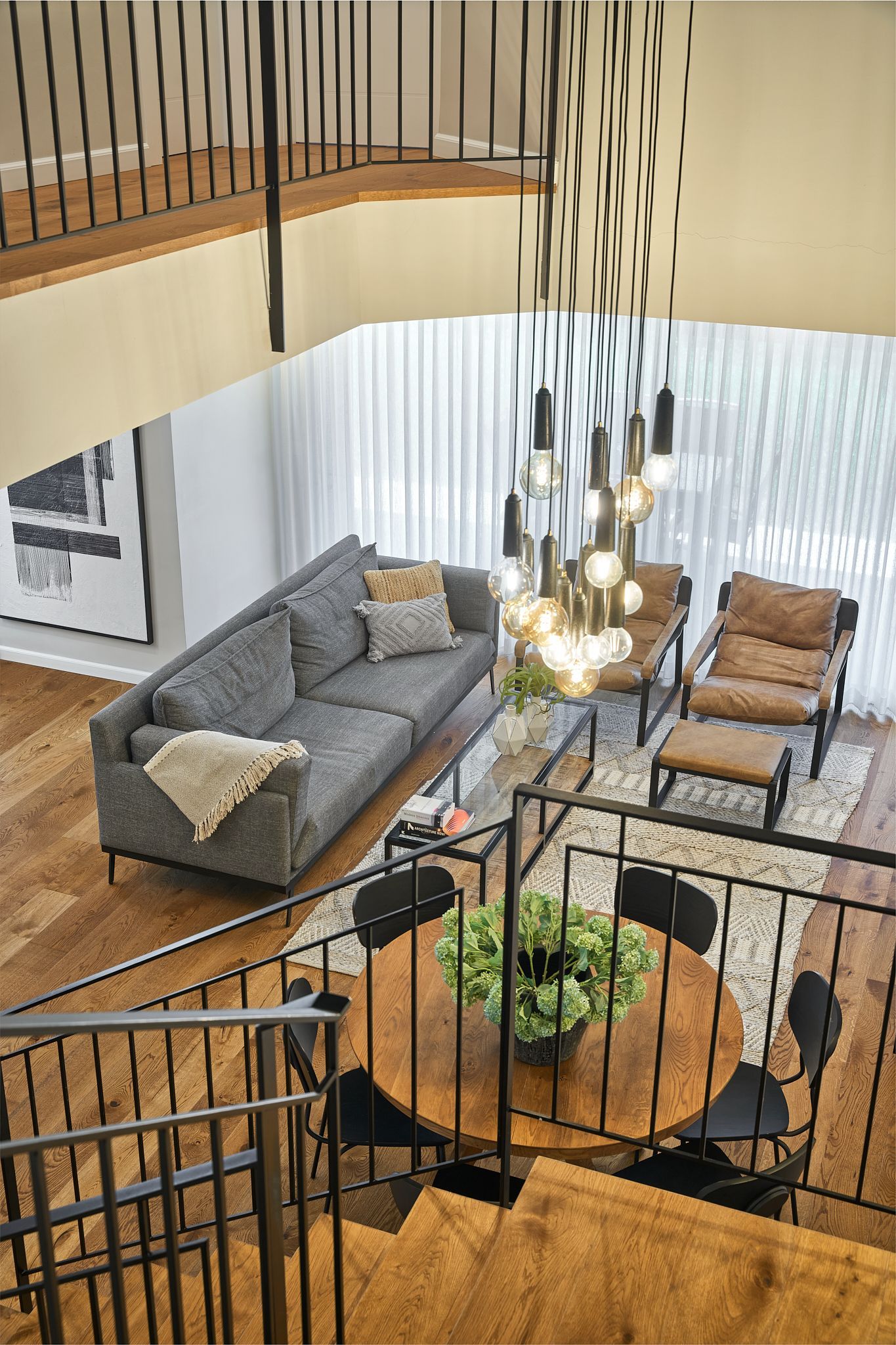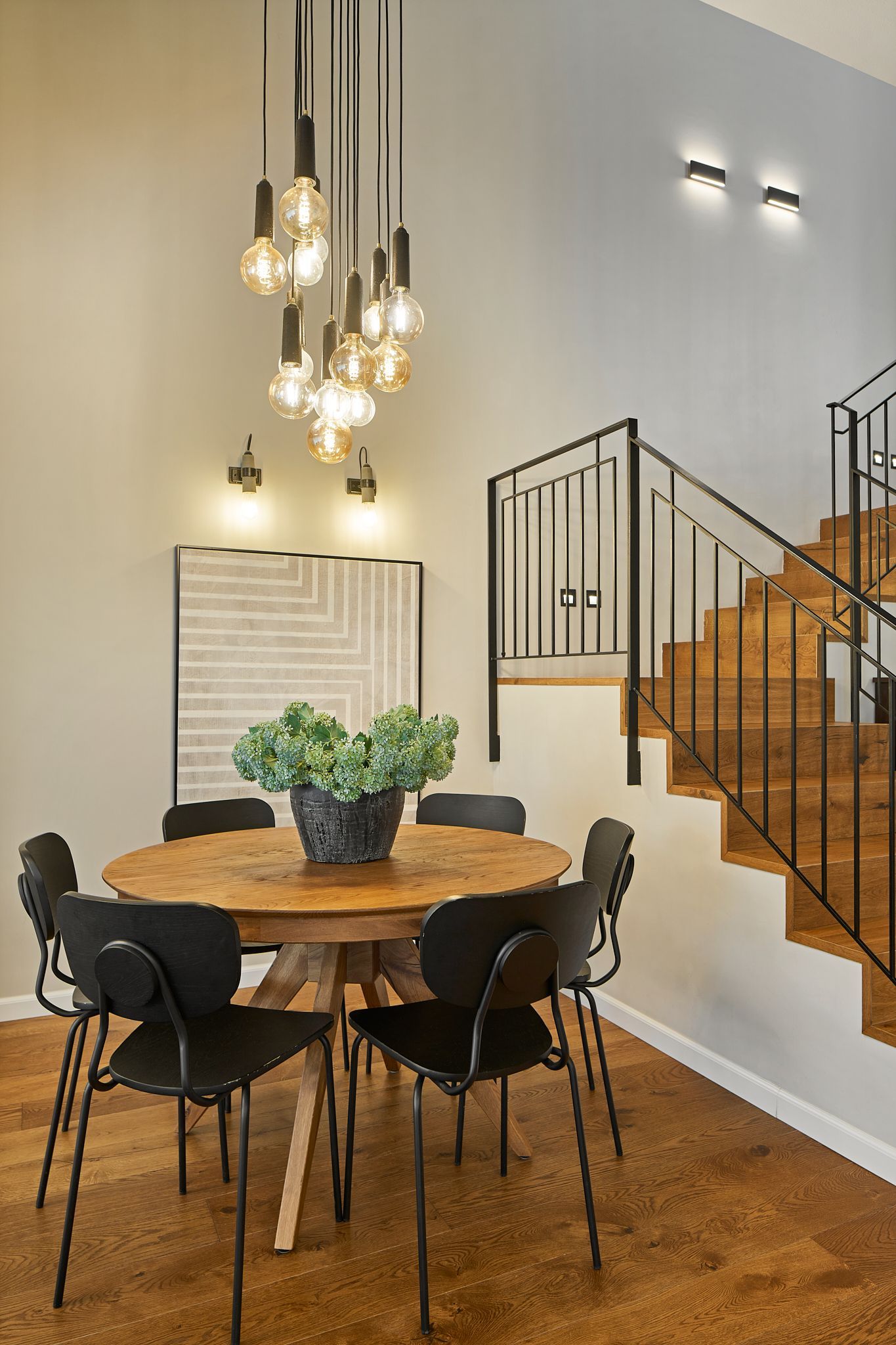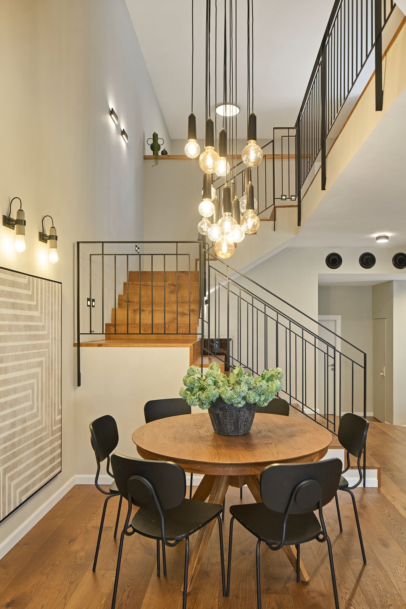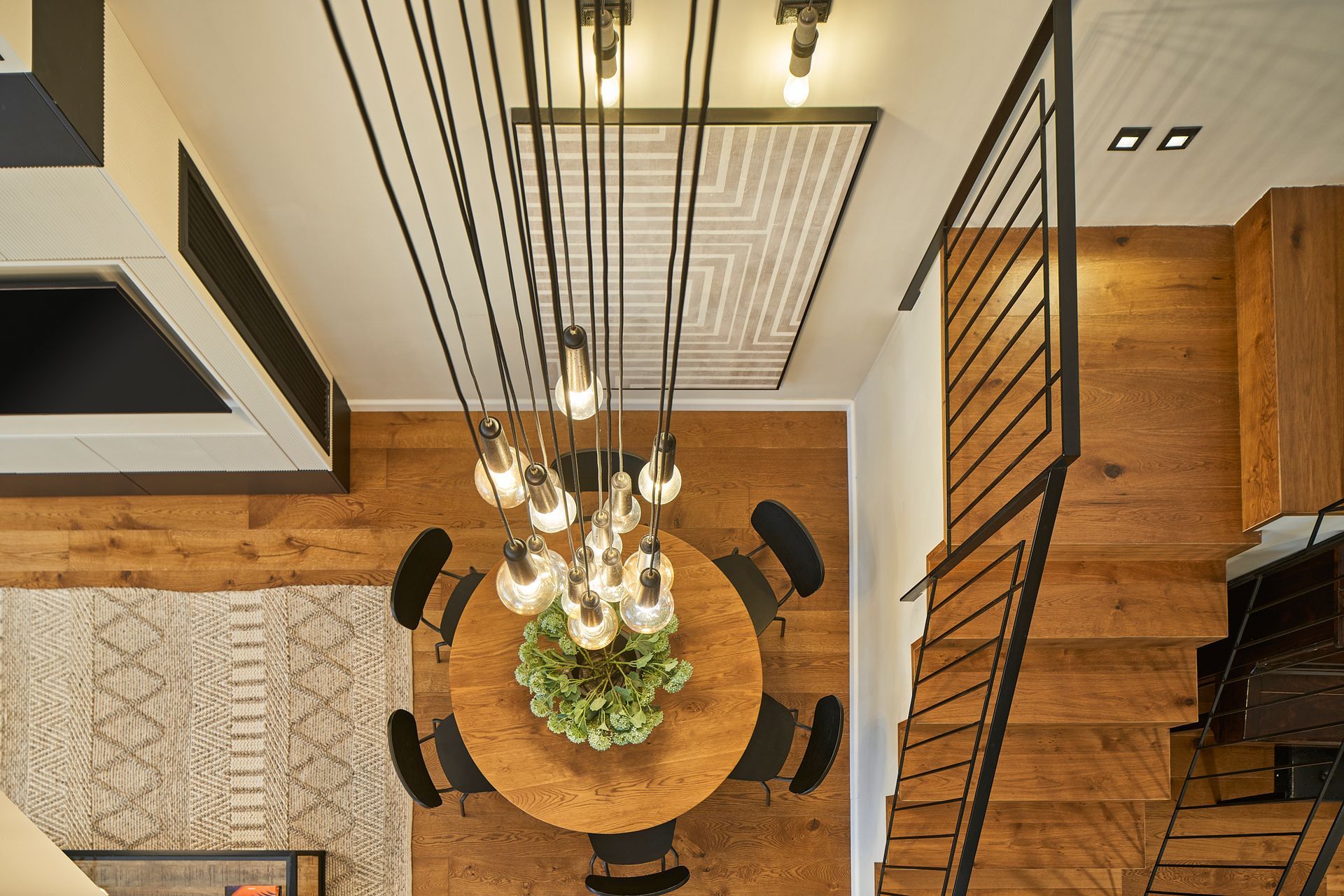 פינת האוכל מוקמה מתחת לחלל הכפול ומעליה גוף תאורה בטוני- צרור נורות פחם היורד מגובה של קרוב לשישה מטרים.