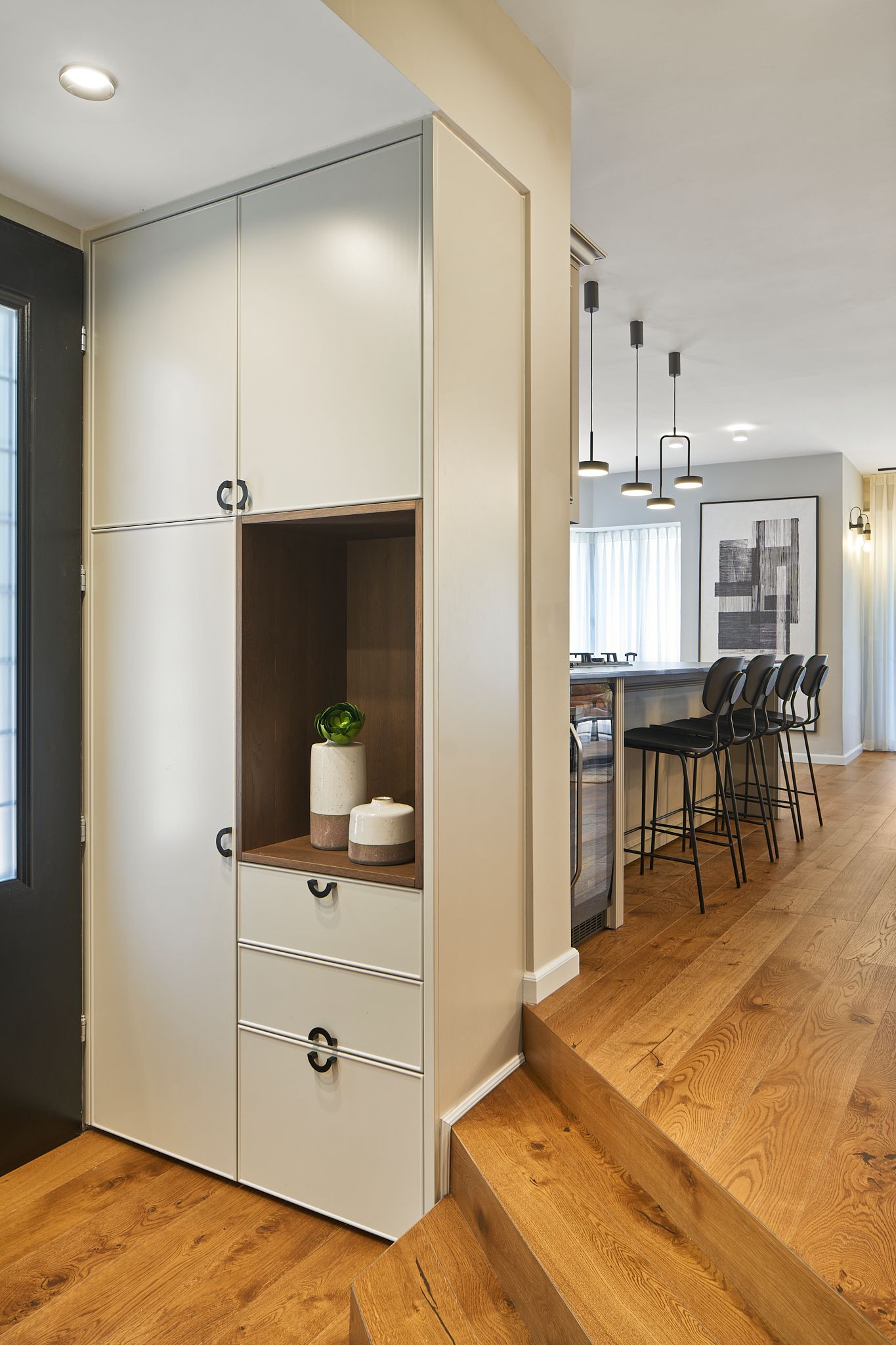 הכניסה לבית ממוקמת במפלס הנמוך בשלוש מדרגות מקומת הקרקע שם יצרנו מבואת כניסה עם נגרות ותאורה תואמת.