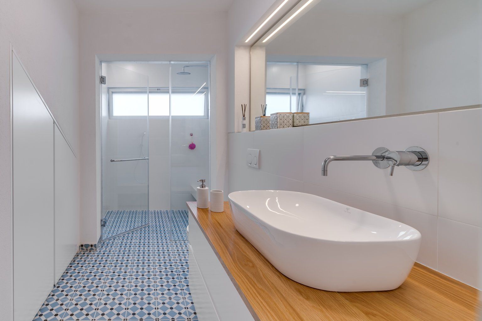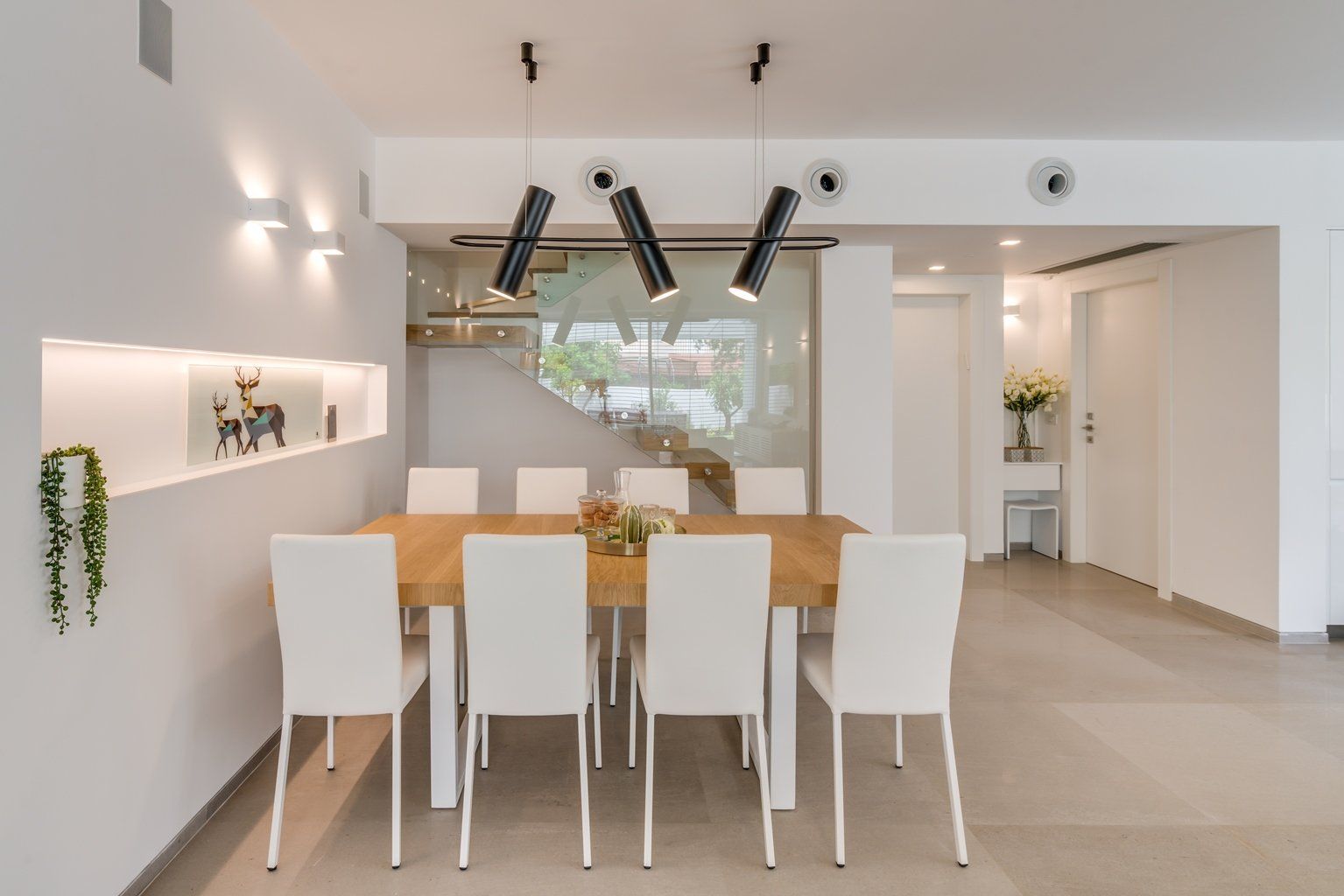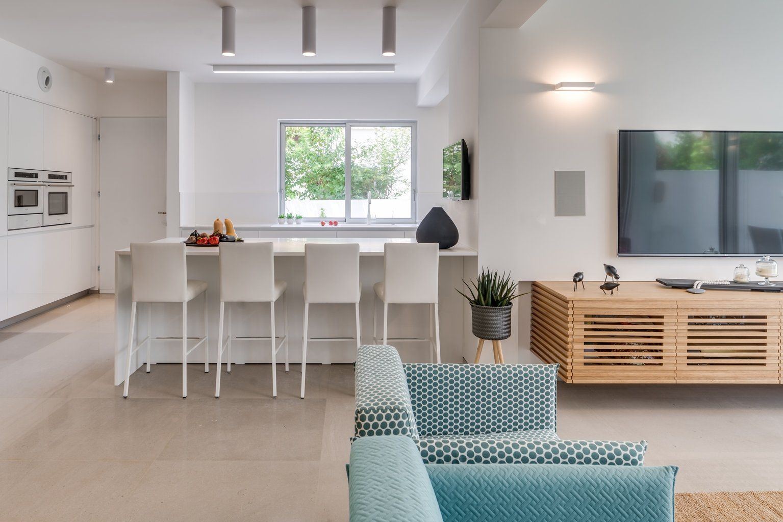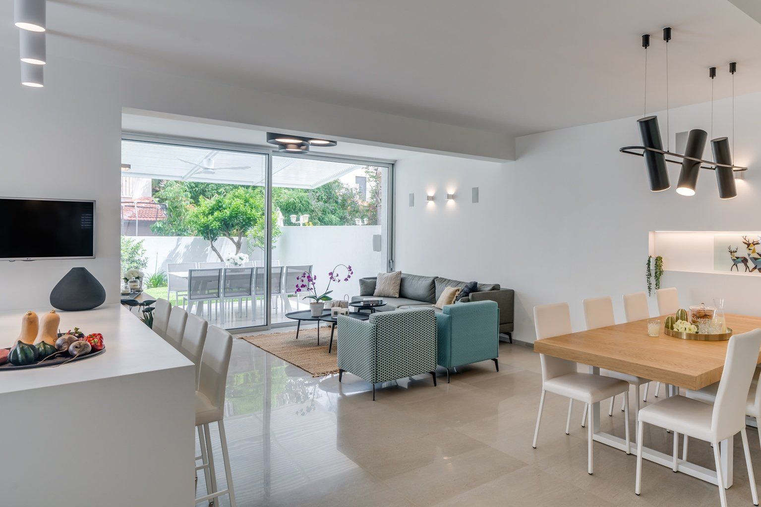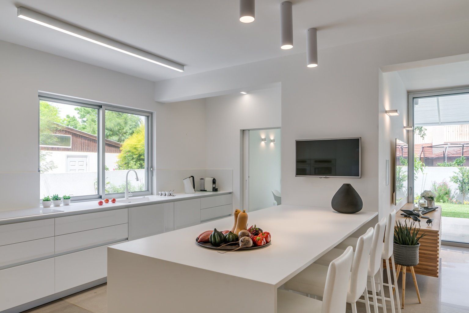 התוצאה - בית מואר ומזמין עם חצר שעוטפת אותו, חלונות גדולים מפרופיל אלומיניום בגוון אלומיניום טבעי כמו שאני אוהבת - החומר עצמו, רצפת אבן בהירה מלוטשת, שימוש בעץ אלון מבוקע להכנסת חמימות, נגרות בלבן ורקע לבן.