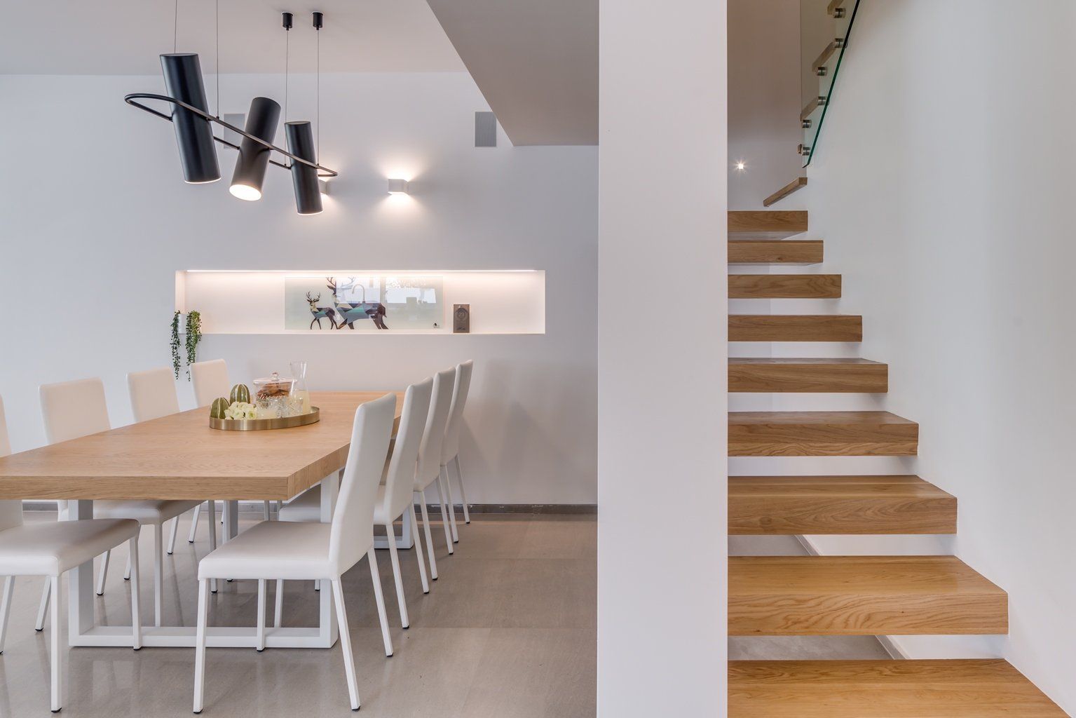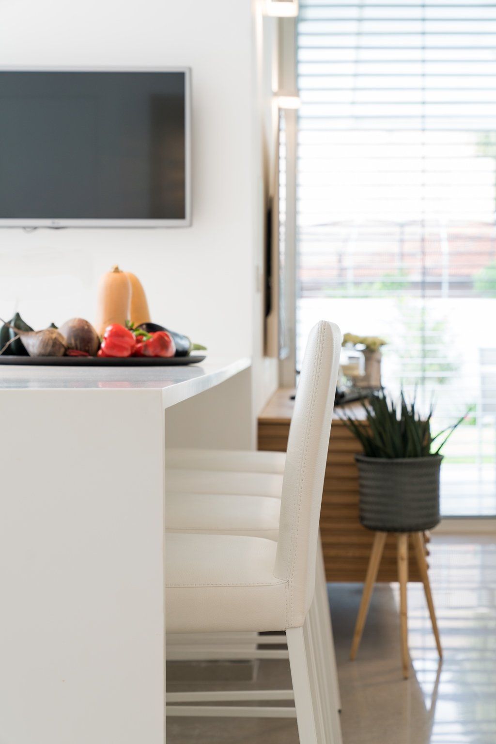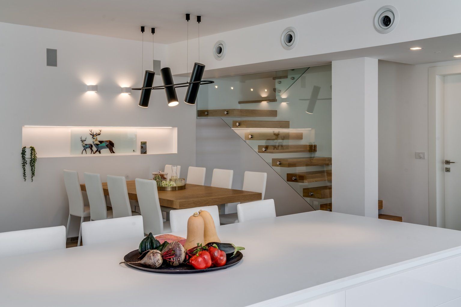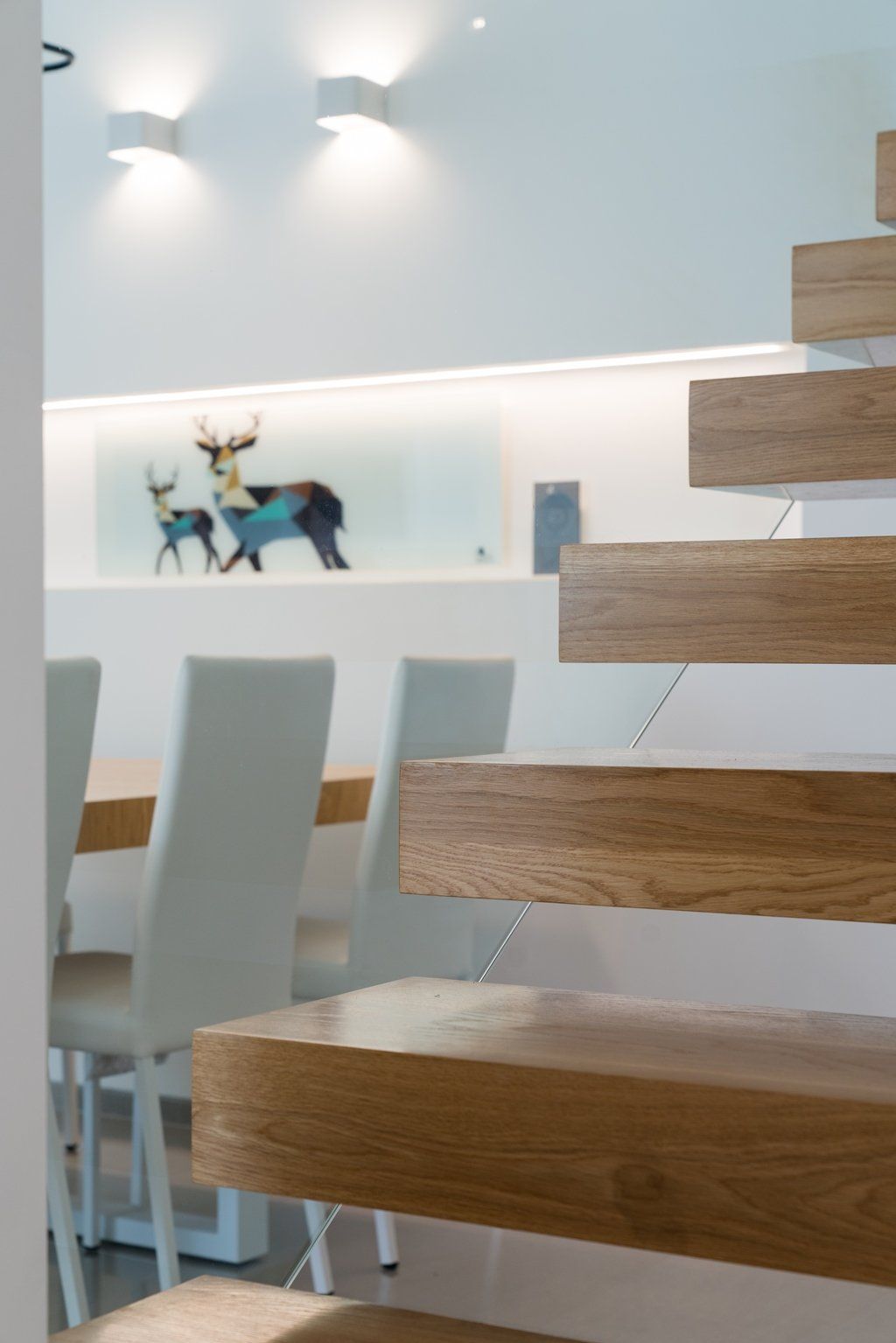 המטבח נושק לסלון ולפינת האוכל ו"מופרד ע"י אי גדול מיימדים. גרם מדרגות מרחף עם מעקה זכוכית מרמז על הקומה למעלה.