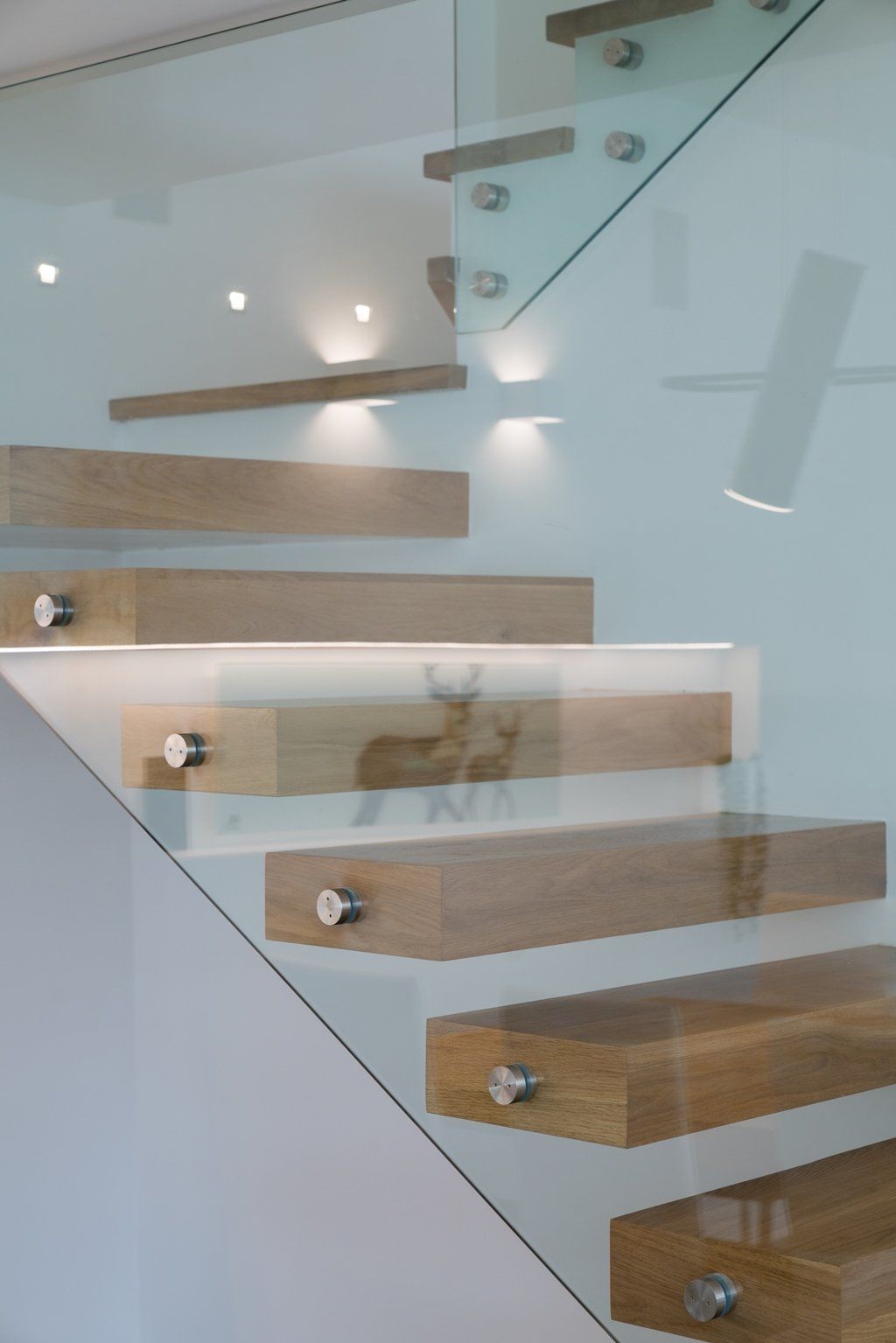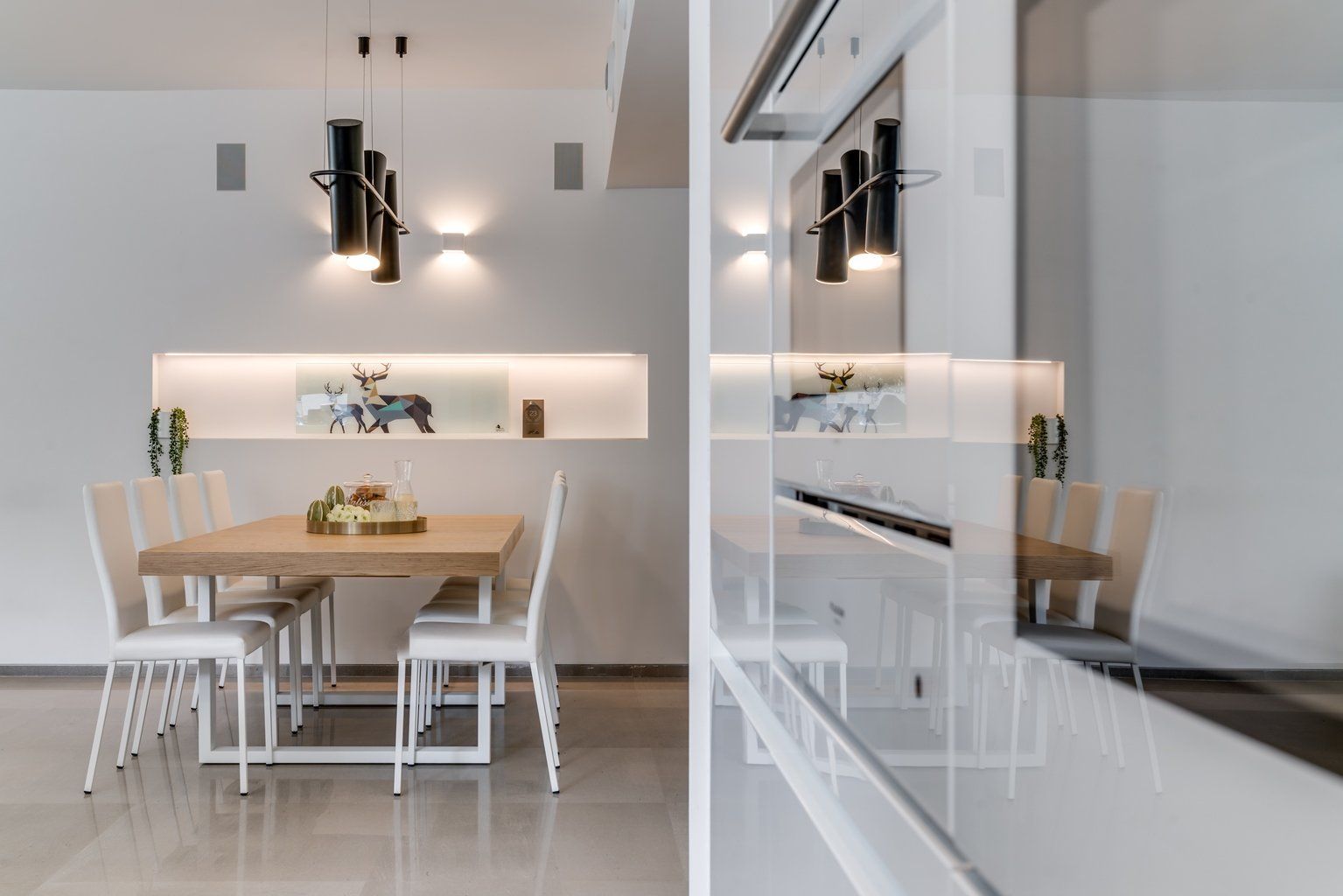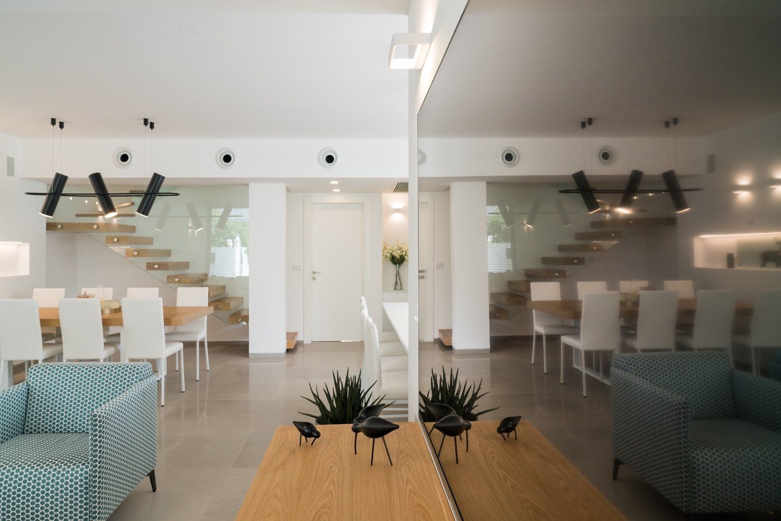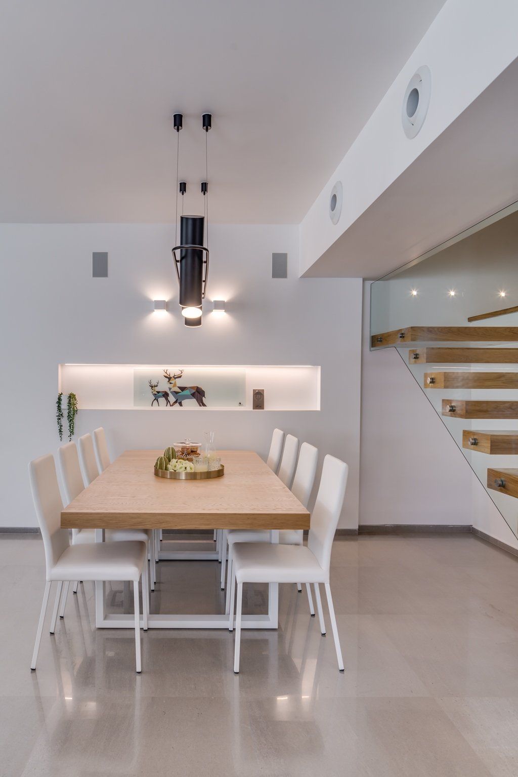 המטבח נושק לסלון ולפינת האוכל ו"מופרד ע"י אי גדול מיימדים. גרם מדרגות מרחף עם מעקה זכוכית מרמז על הקומה למעלה.